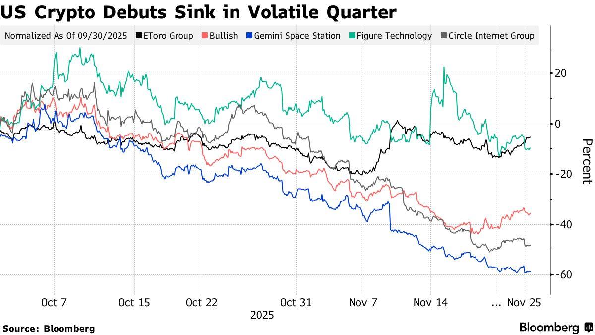 即使在 10 月初开始的加密货币价格暴跌导致数字资产总市值蒸发超过 1 万亿美元之前,市场对加密货币 IPO 的反应也好坏参半。具体来说,加密货币交易所Gemini Space Station的股价(GEMI.US)于9月上市,发行价为28美元,第三季度下跌14%。 ETORO集团(ETOR.US)股价进一步恶化,自5月上市至9月30日下跌超过20%。倒闭前表现良好的公司并未受到影响。 Tom Farley 运营的机构加密货币交易所 Blish (BLSH.US) 于 8 月上市,自 10 月初以来已下跌 38%。